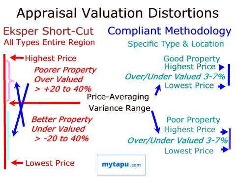 These flawed and non-compliant practices do not determine the market value of a property. In addition the prices of specific properties used for comparison are not verifiable because they are co-mingled in a group average. These faulty and non-compliant practices typically result in a 20-40% range of variance in valuation results – in some specific locations the range may be higher. These Eksper valuations do not serve purpose, are easily challenged and over-turned, and may lead to disputes and litigation.